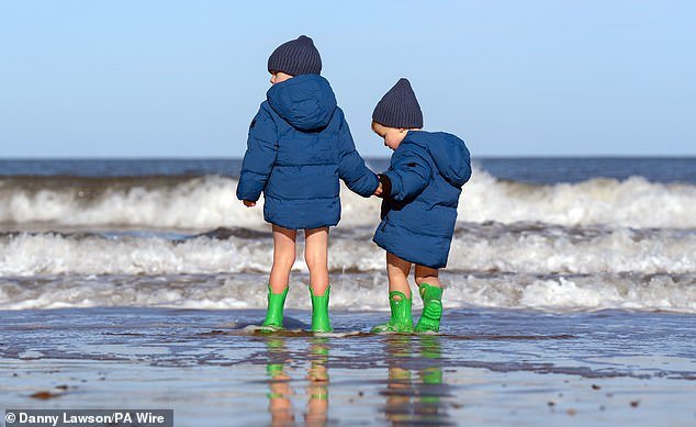Dos niños juegan en el mar en un día frío en Scarborough en el semestre de octubre del año pasado