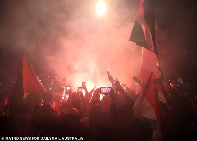 En una protesta desde 2023 frente a la ópera en Sydney, una bandera israelí ardió y las antorchas dispararon