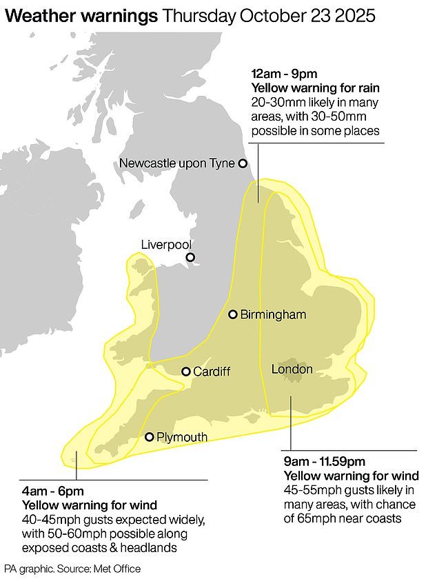 El portavoz del RAC, Rod Dennis, dijo: “El jueves será un día desafiante para los conductores, y el viaje nocturno probablemente será un asunto muy húmedo y ventoso para muchos”.