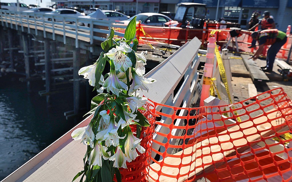 El lunes habían sido colocados lirios en el muelle por donde el vehículo atravesó la barandilla y un equipo de la ciudad de Santa Cruz trabajaba para reparar los daños.