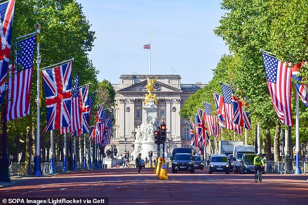 Durante su segundo estado, docenas de banderas de Estados Unidos y británicas fueron volados a lo largo del centro comercial el mes pasado y las calles cerca del Castillo de Windsor en Berkshire.
