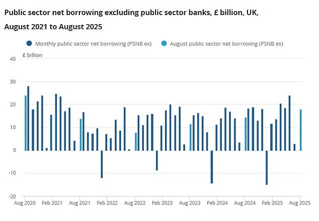 En agosto, los gastos del sector público fueron de £ 18 mil millones, a pesar de los ingresos fiscales, libras más que en los ingresos. El nivel fue el más alto para el mes desde 2020 cuando el país intentó lidiar con Covid