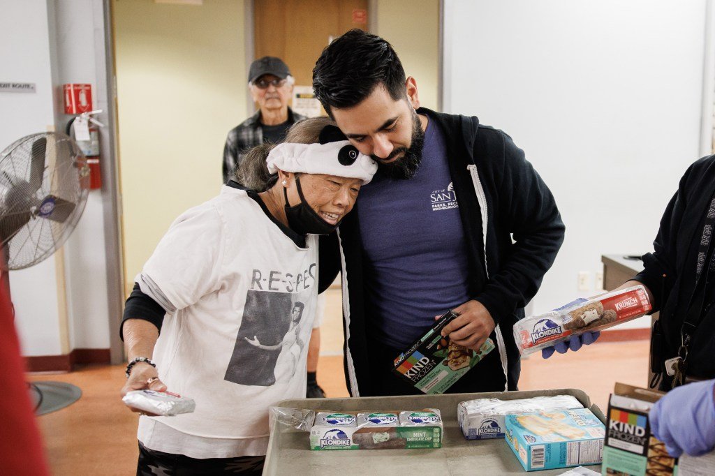 Mercy Wong, de 66 años, izquierda, miembro del grupo sin fines de lucro Friends of Grace, recibe un almuerzo en el Centro Comunitario JTS Northside el 3 de noviembre de 2025. La comida cuenta con el apoyo de una asociación entre Friends of Grace y Martha’s Kitchen. (Dai Sugano/Grupo de Noticias del Área de la Bahía)