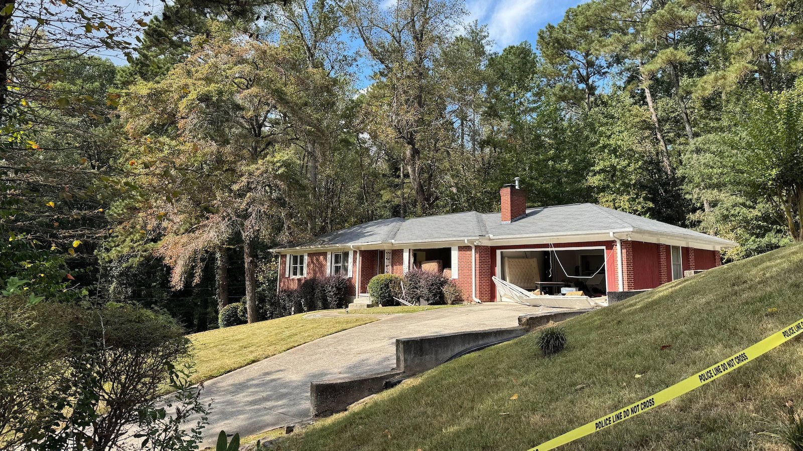 La puerta del garaje de la casa de ladrillo se derrumbó hacia adentro y fue bloqueada por la policía después de que Groves fuera detenido. La casa está ubicada en un vecindario al lado de Tyler Perry Studios, una de las instalaciones de producción cinematográfica más grandes del país.