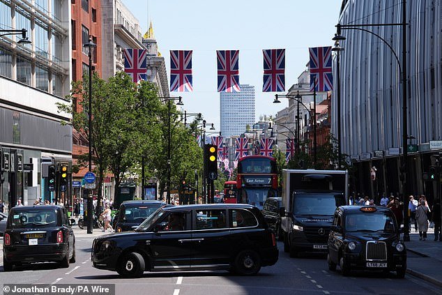 Atasco de tráfico en junio de 2025 en Oxford Street de Londres, que será peatonal