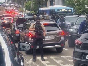 Más abajo en River Road, la policía rodeó una superposición de Mitsubishi-Suv con agujeros de bala con los funcionarios antes de que los funcionarios arrastraran a un tercer hombre desde el asiento del conductor.