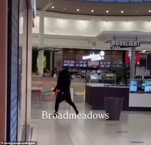 Los compradores, llorando, tuvieron que correr a refugiarse después de que dos hombres enmascarados y armados con machetes comenzaron una pelea en un centro comercial de Melbourne el viernes por la noche.