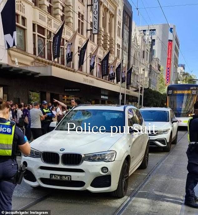 Un automóvil supuestamente robado de una pandilla que supuestamente está armado con machetes fue perseguido por la policía el lunes por la policía de Melbournes Bourke St. Mall.