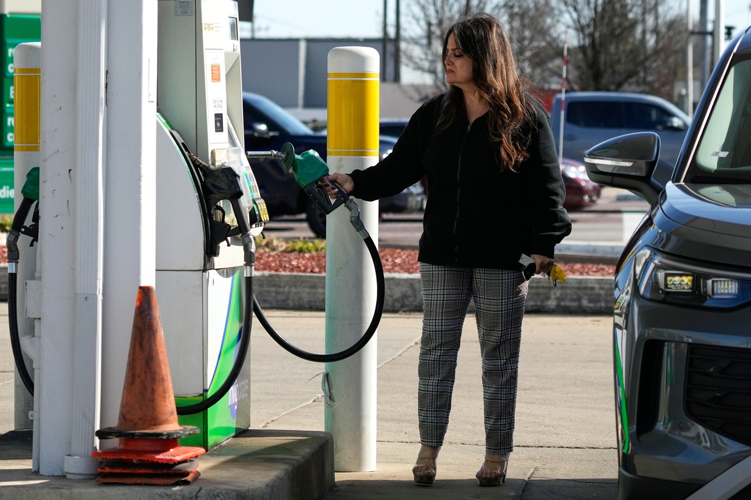 Una mujer comprueba los precios de la gasolina antes de llenar el tanque de su vehículo en una gasolinera en Morton Grove, Illinois, el 7 de abril de 2026.
