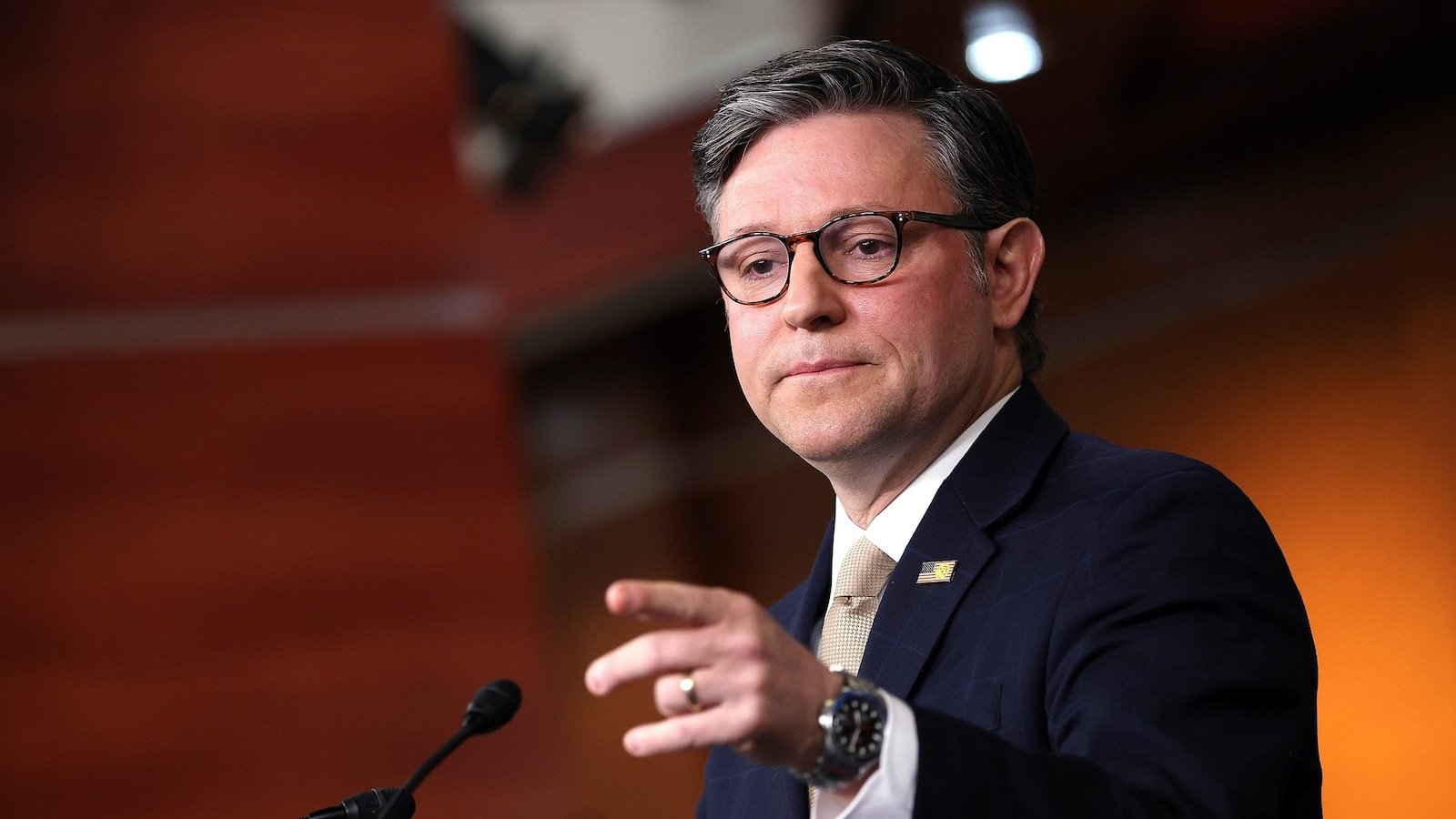 El presidente de la Cámara de Representantes, Mike Johnson, habla en una conferencia de prensa en el Capitolio de los Estados Unidos el 21 de abril de 2026 en Washington, DC.