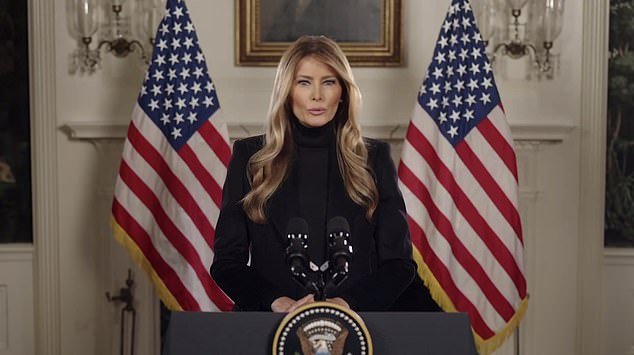 Mientras la transmisión se transmitía a la Casa Blanca, la primera dama comenzó a hablar desde un podio en la sala de recepción diplomática.