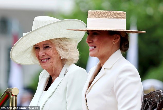 La reina Camilla (izquierda) sonríe bajo su sombrero de ala ancha mientras se sienta junto a la primera dama Melania Trump (centro izquierda) para una ceremonia de bienvenida con el rey Carlos (derecha) en el jardín sur de la Casa Blanca el martes por la mañana.