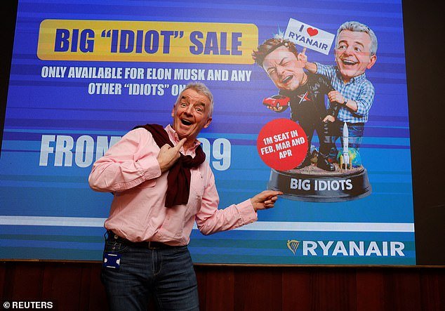 En una conferencia de prensa en Dublín esta mañana junto a su número dos, Eddie Wilson, O’Leary respondió y lanzó una venta de “Gran Idiota” con una caricatura de Musk de aspecto dolorido como mascota.