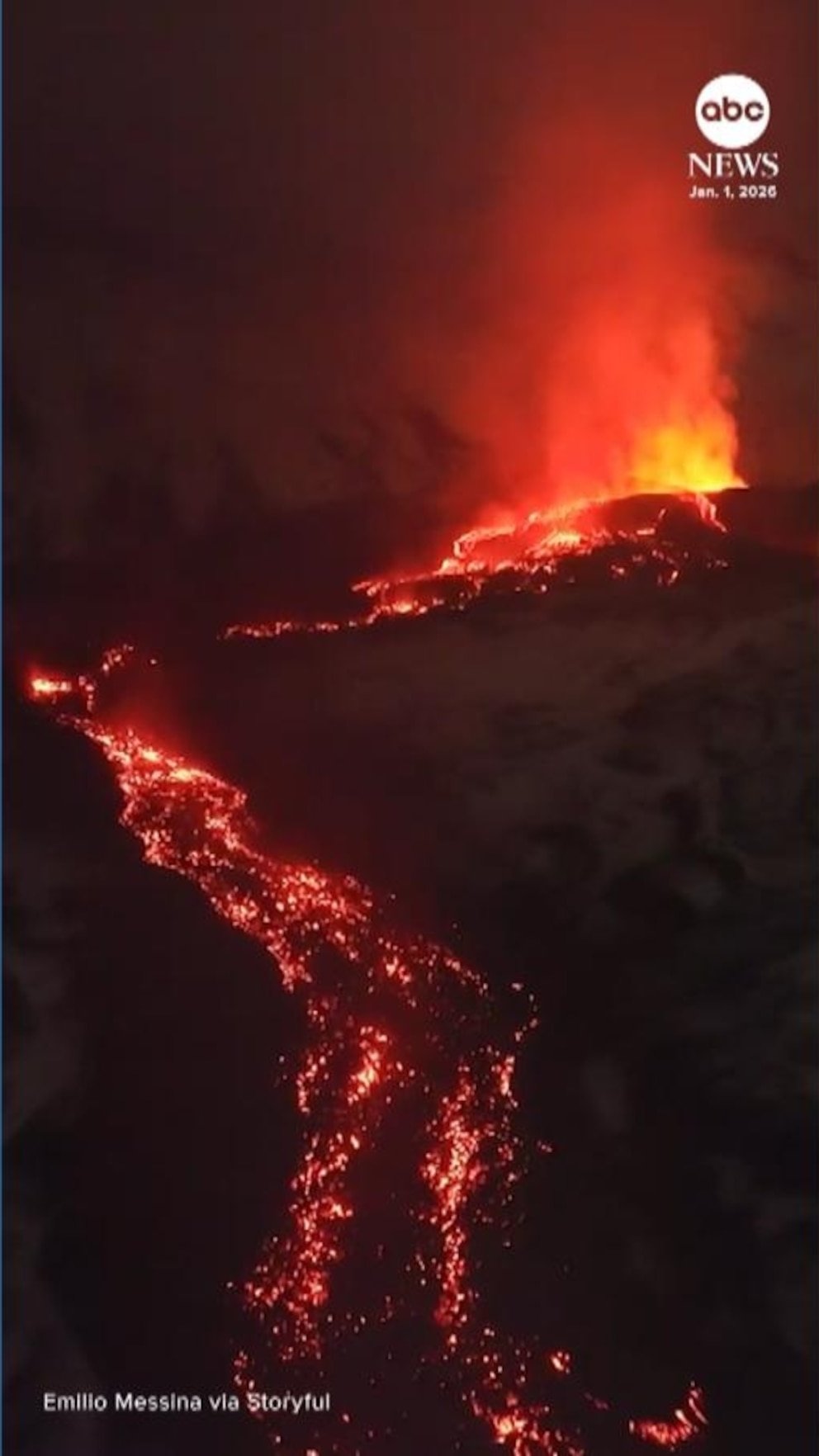 Un dron capturó impresionantes imágenes de lava fluyendo desde una fisura en el Monte Etna de Italia el día de Año Nuevo.