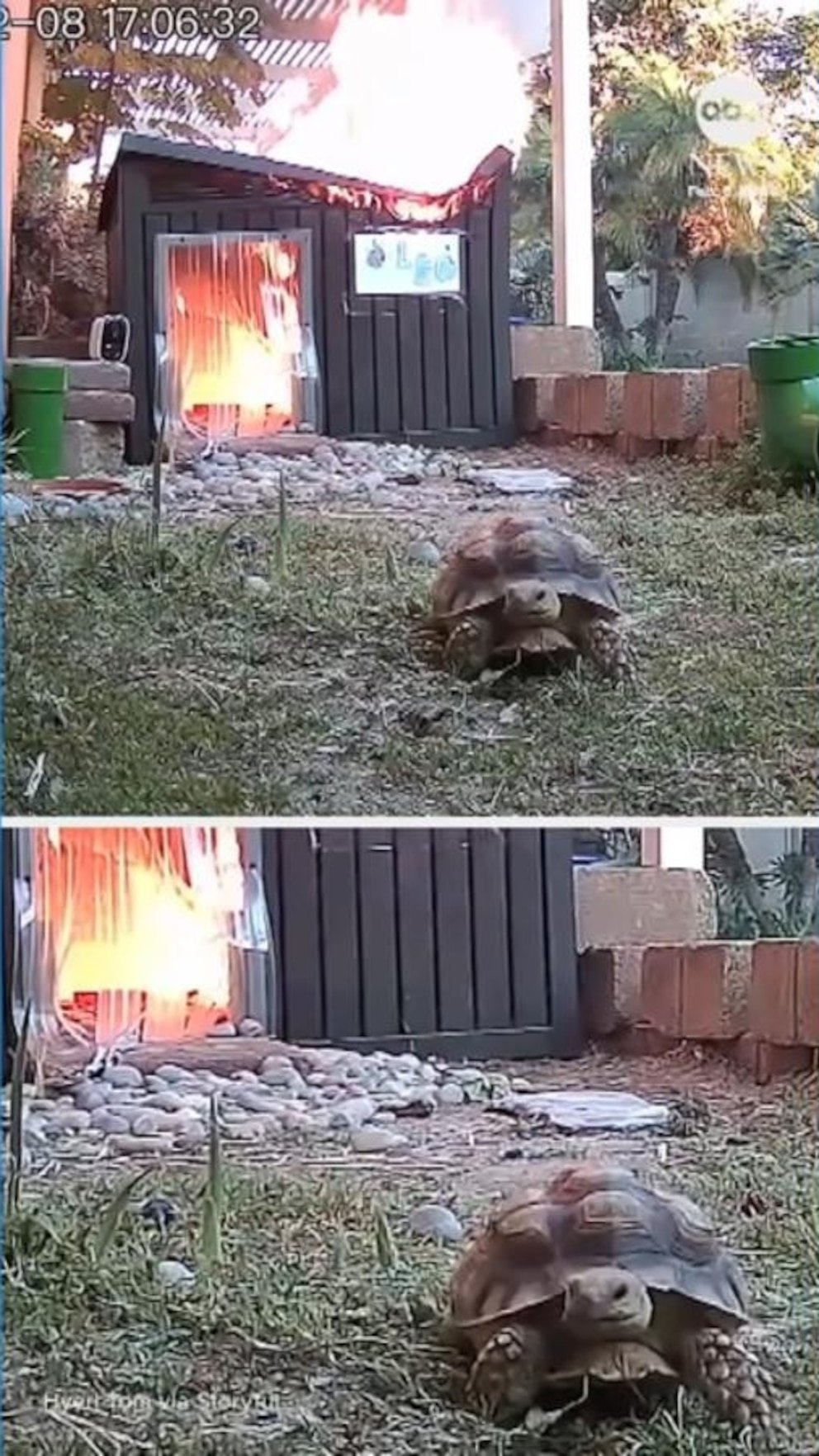 Una tortuga mascota escapó de un incendio que destruyó el cobertizo donde vive después de que una lámpara de calor cayera e incendiara su recinto en el sur de California.