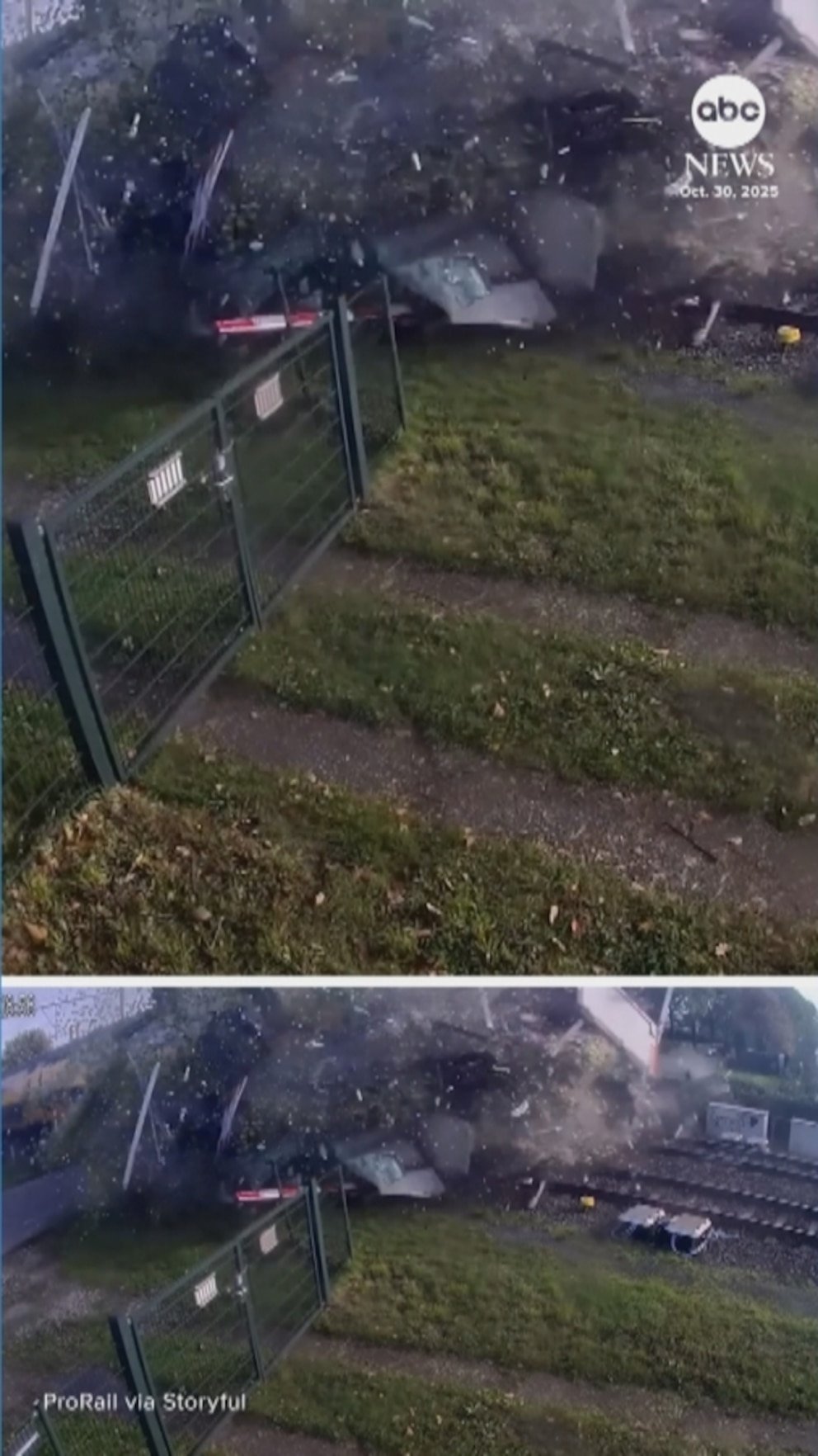 Imágenes de vigilancia capturaron el momento en que un tren chocó contra un camión parado en un paso a nivel en los Países Bajos, haciendo volar su carga de peras.
