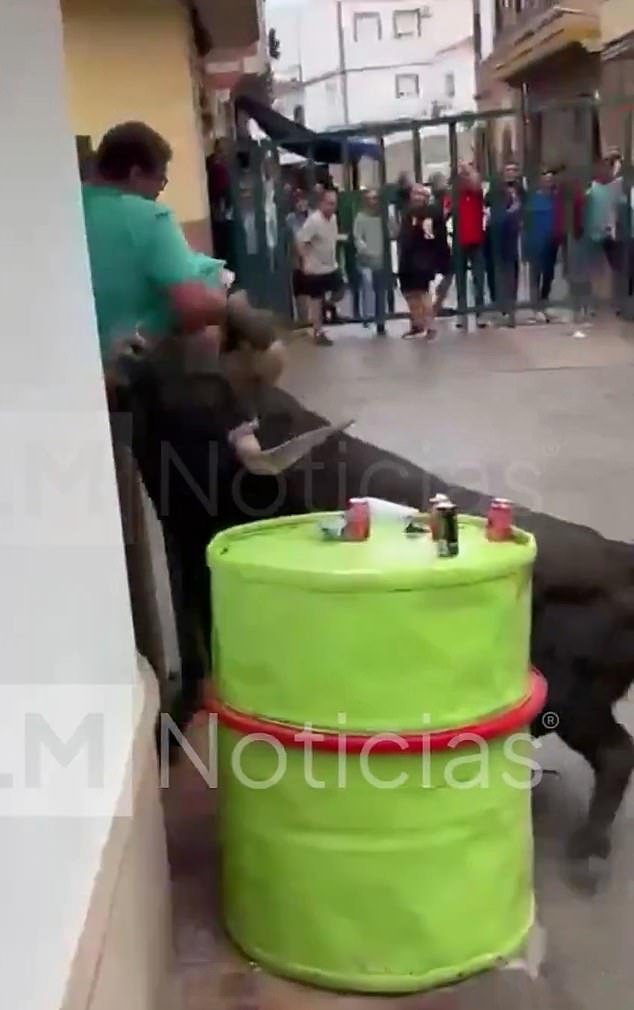 Mientras el padre de dos hijos se agazapaba detrás de un barril, el animal se agitaba y usaba sus cuernos para lanzarlo por los aires.