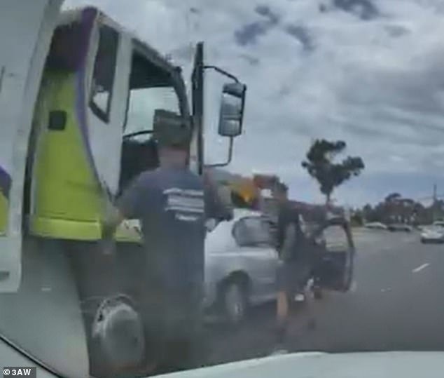 Imágenes aterradoras capturaron el momento en que estalló una rabieta en una concurrida carretera de Melbourne después de que dos extraños atacaron a un conductor anciano.