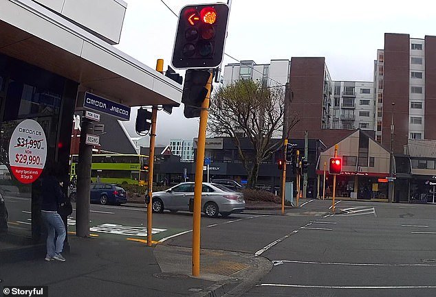 Las imágenes de la cámara del tablero publicadas por el transeúnte Justin Ashworth el jueves mostraron al desafortunado peatón esperando en un cruce en una intersección de Wellington.
