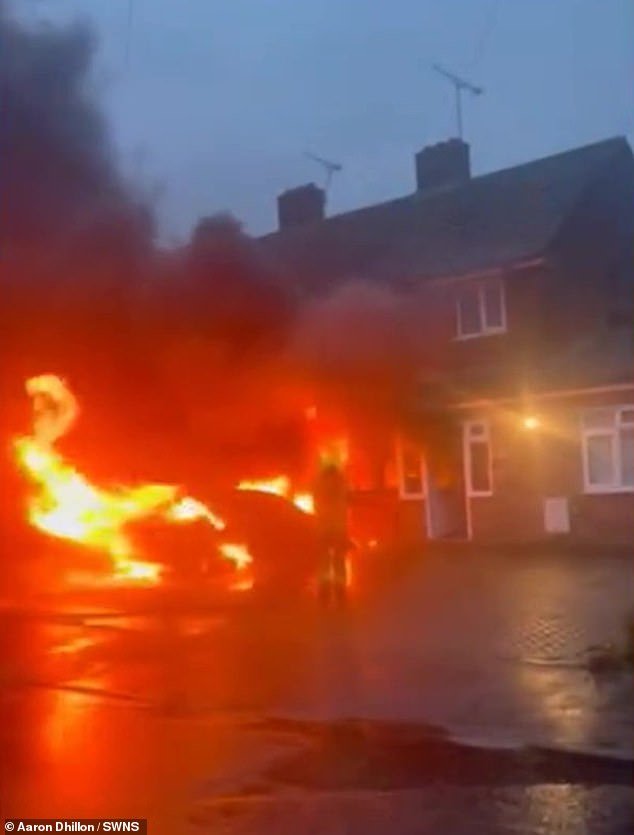 El contratista de construcción Aaron Dhillon, de 36 años, de Northfleet, Kent, se levantó para ver cómo su auto se puso en llamas después de que su tía lo alertara, que el drama desarrolló por la ventana de su casa cercana.
