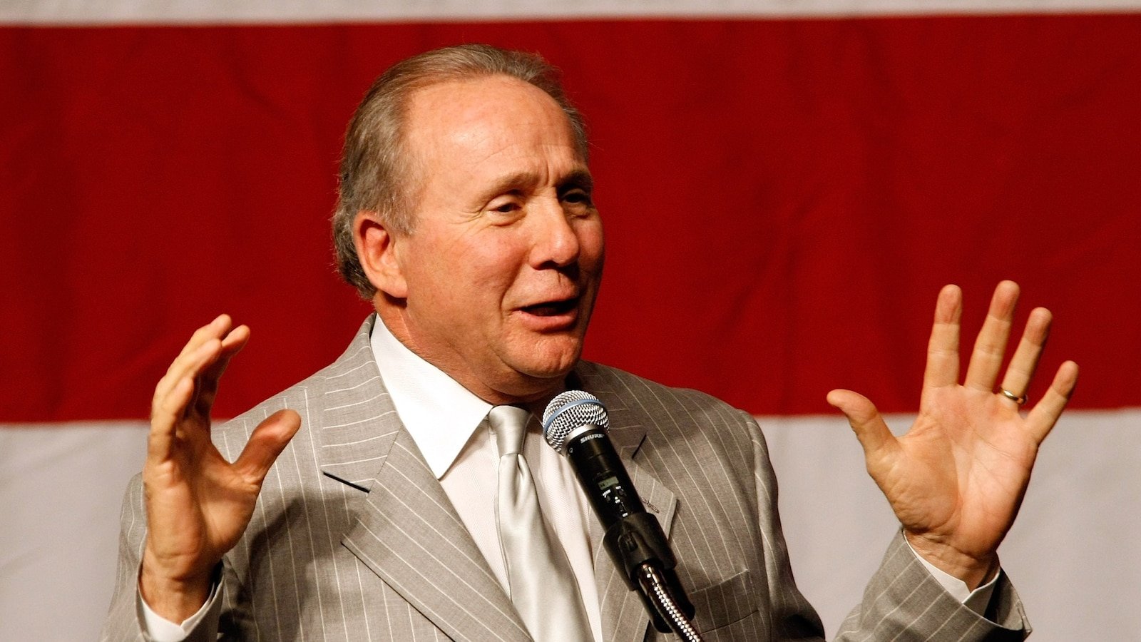 El estratega republicano Michael Reagan habla en un mitin de campaña de la candidata republicana al Senado Sharron Angle con el senador John McCain el 29 de octubre de 2010 en Las Vegas.