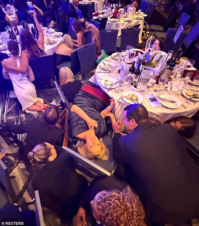 Nos escondimos debajo de la mesa, temiendo que dispararan más. NICK ALLEN cuenta el pánico en el salón de baile cuando un “pistolero” lanzó un ataque frenético contra el Washington Hilton.