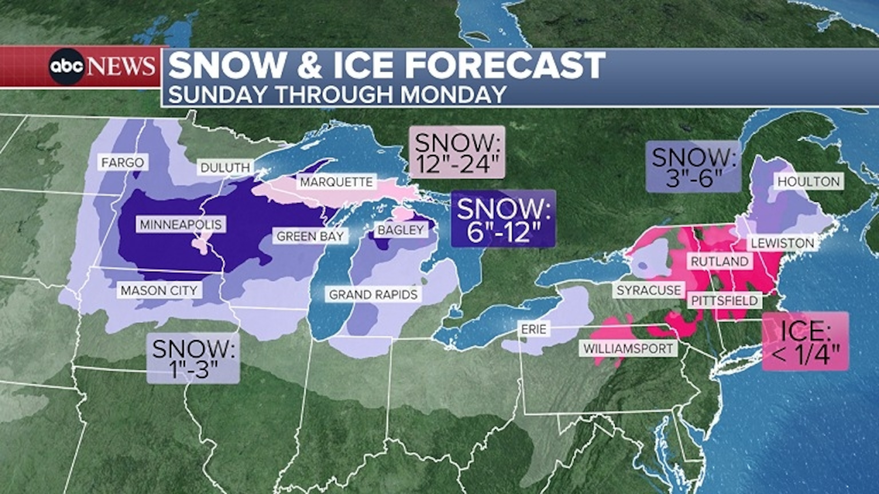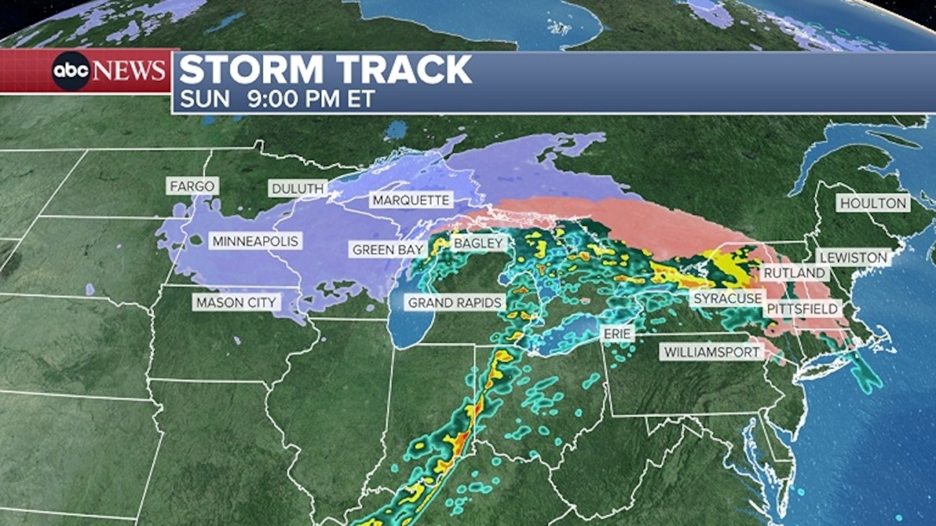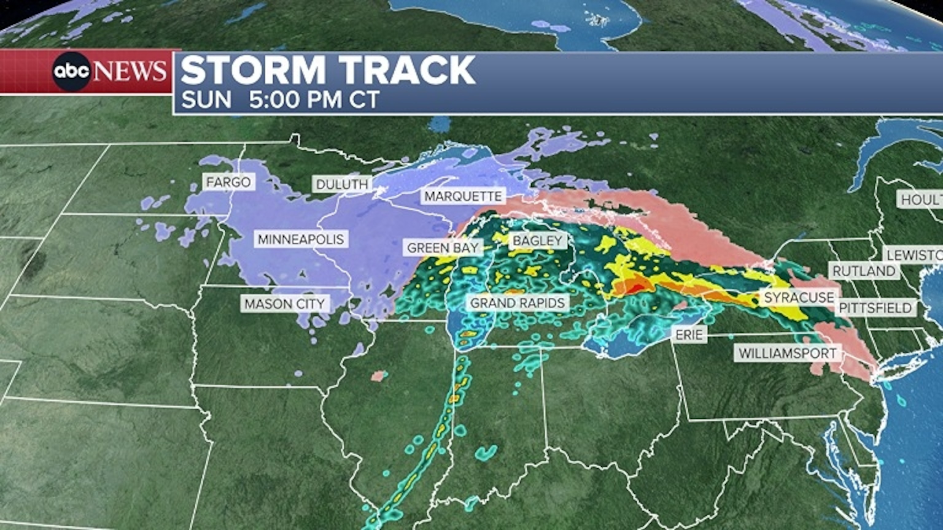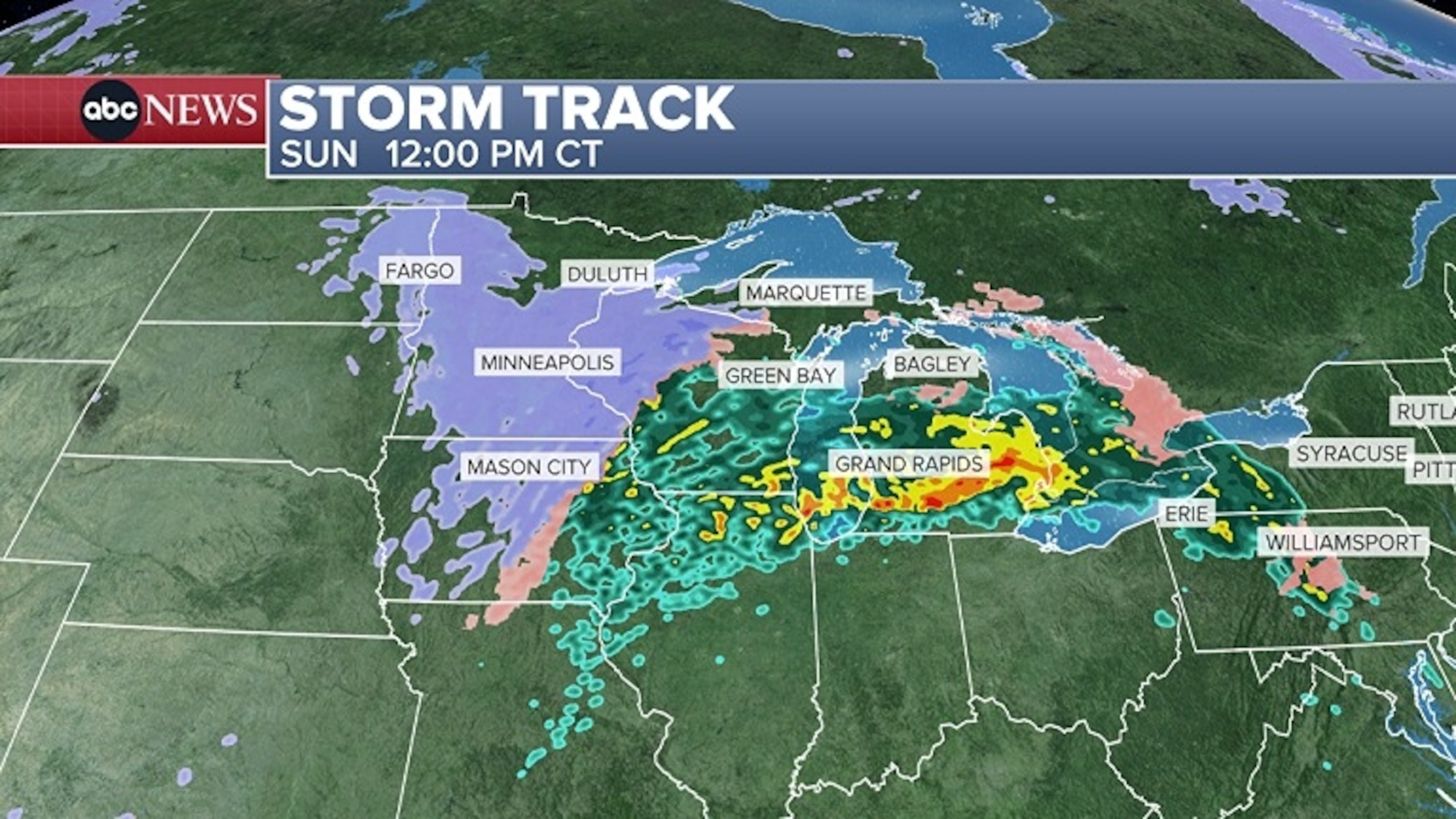 Se espera que fuertes nevadas lleguen a Minneapolis y Mason City, Iowa, alrededor de las 12 p.m. CT el domingo. Se espera una mezcla invernal en Marquette, Michigan, y Green Bay, Wisconsin, el domingo por la tarde, con fuertes lluvias continuas en el sur de Michigan, incluidos Grand Rapids y Detroit.