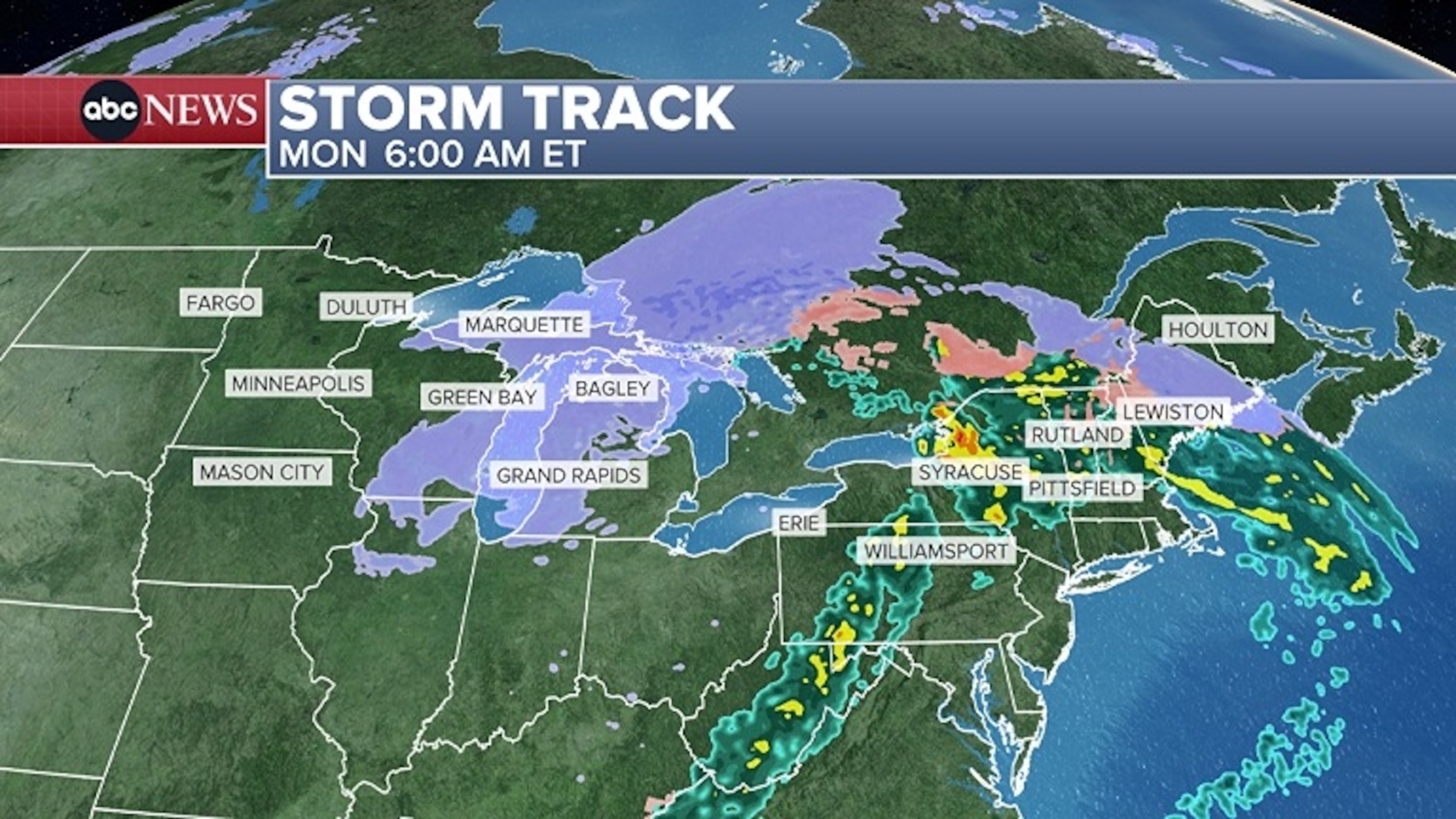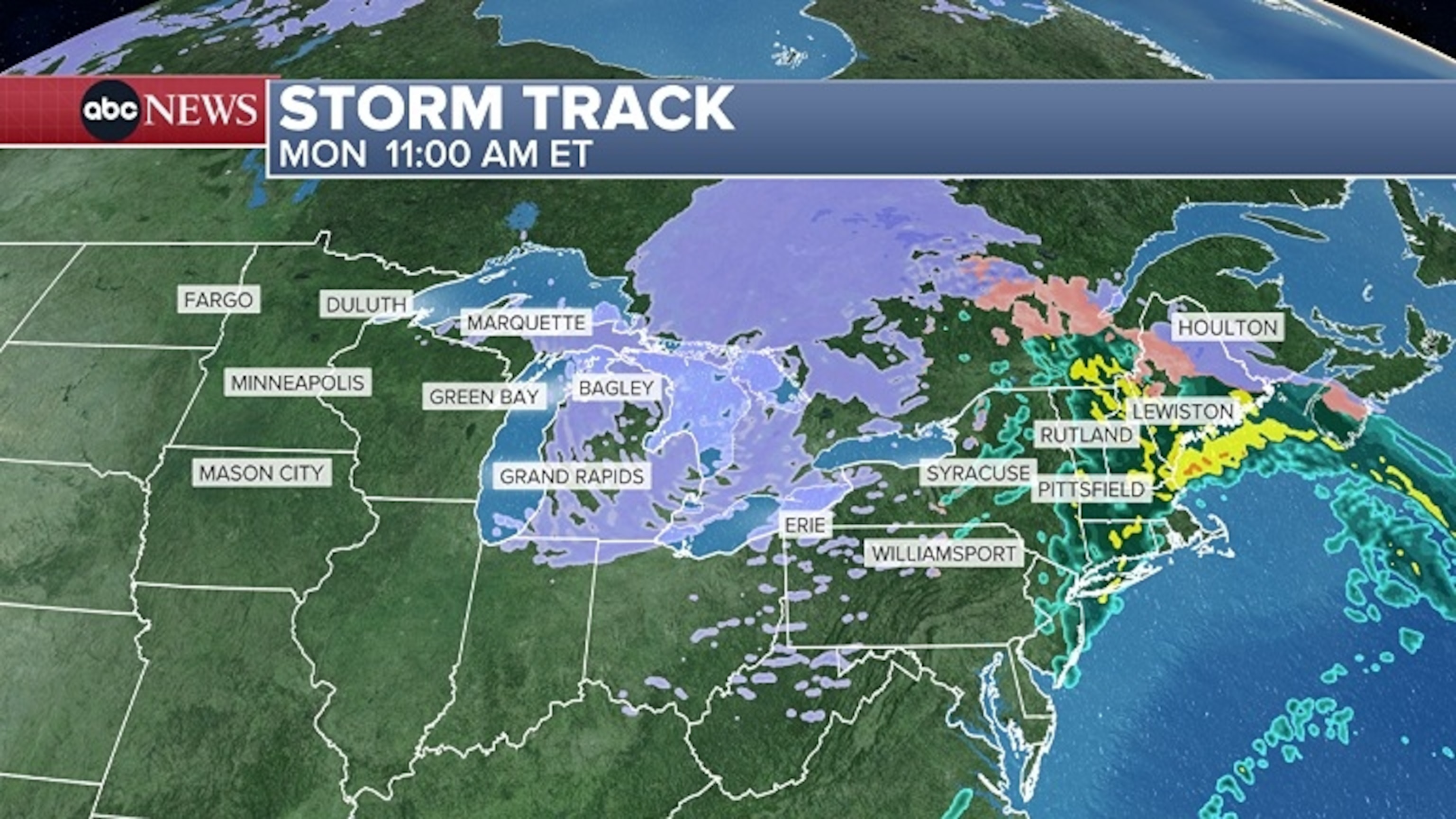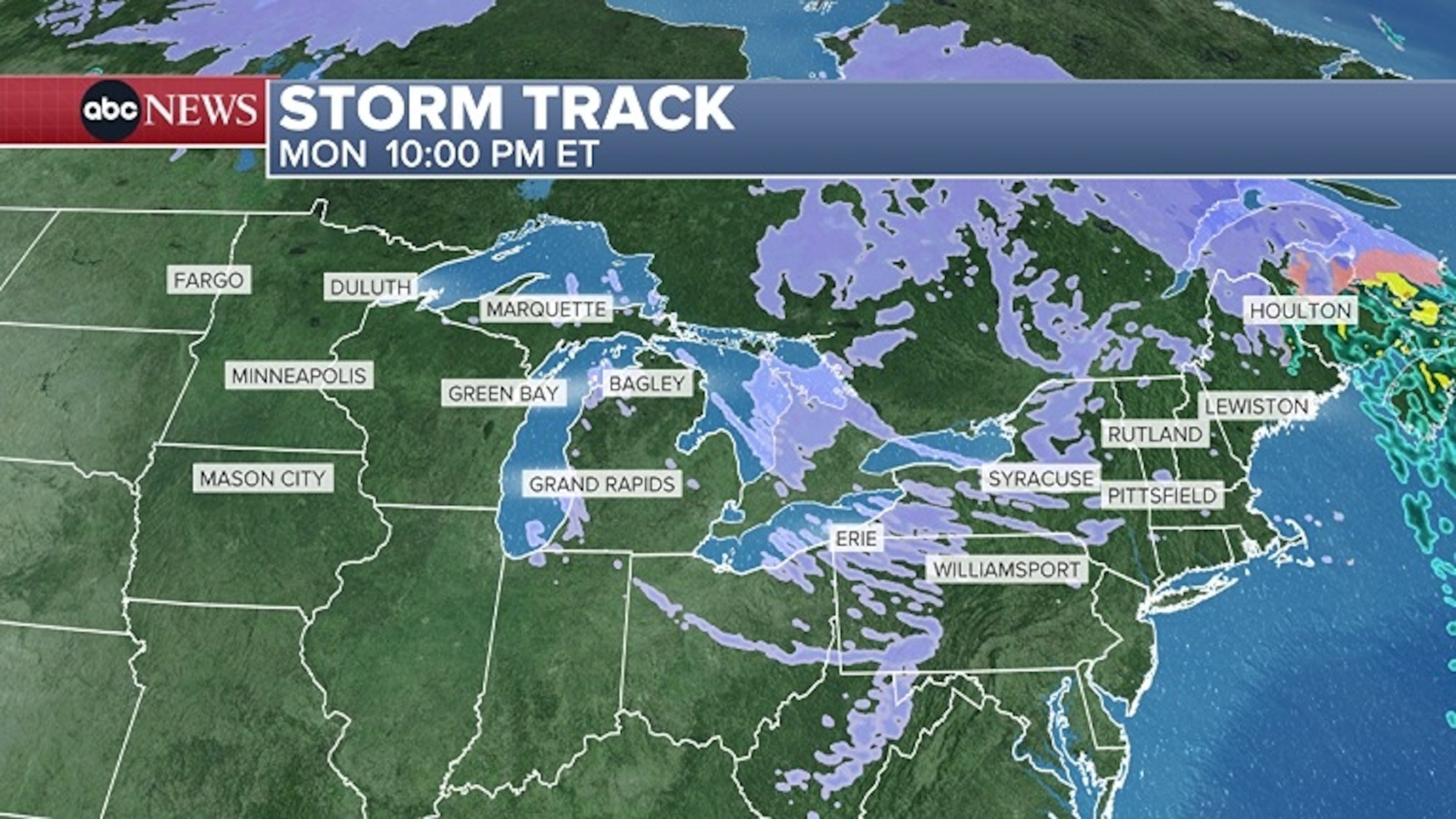Se espera que el sistema de tormentas se haya disipado en gran medida el lunes por la noche, pero después se espera nieve en forma de lago. Para el este de los Grandes Lagos y el interior del noreste, se espera que sea nieve normal con efecto de lago, que durará hasta el martes y posiblemente el miércoles.