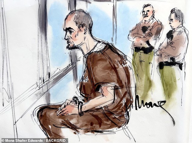 Nick Reiner lució una nueva apariencia en la corte el miércoles con la cabeza rapada y una sombra de cinco en punto, como se ve en este boceto de la sala del tribunal (en la foto).