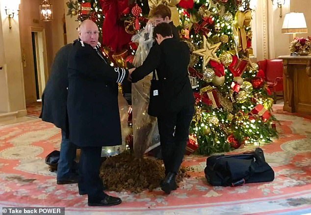 Los activistas vaciaron bolsas de estiércol debajo del árbol de Navidad del vestíbulo, dejando un montón de mugre marrón maloliente sobre la lujosa alfombra mientras las fuerzas de seguridad se apresuraban a intervenir.