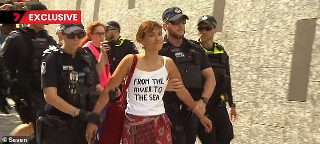 Bonnie Carter estuvo acompañada por oficiales fuertemente armados de la marcha pro Palestina mientras sonreía para las cámaras, con la frase “Del río al mar” escrita en su camiseta con letras negras en negrita.