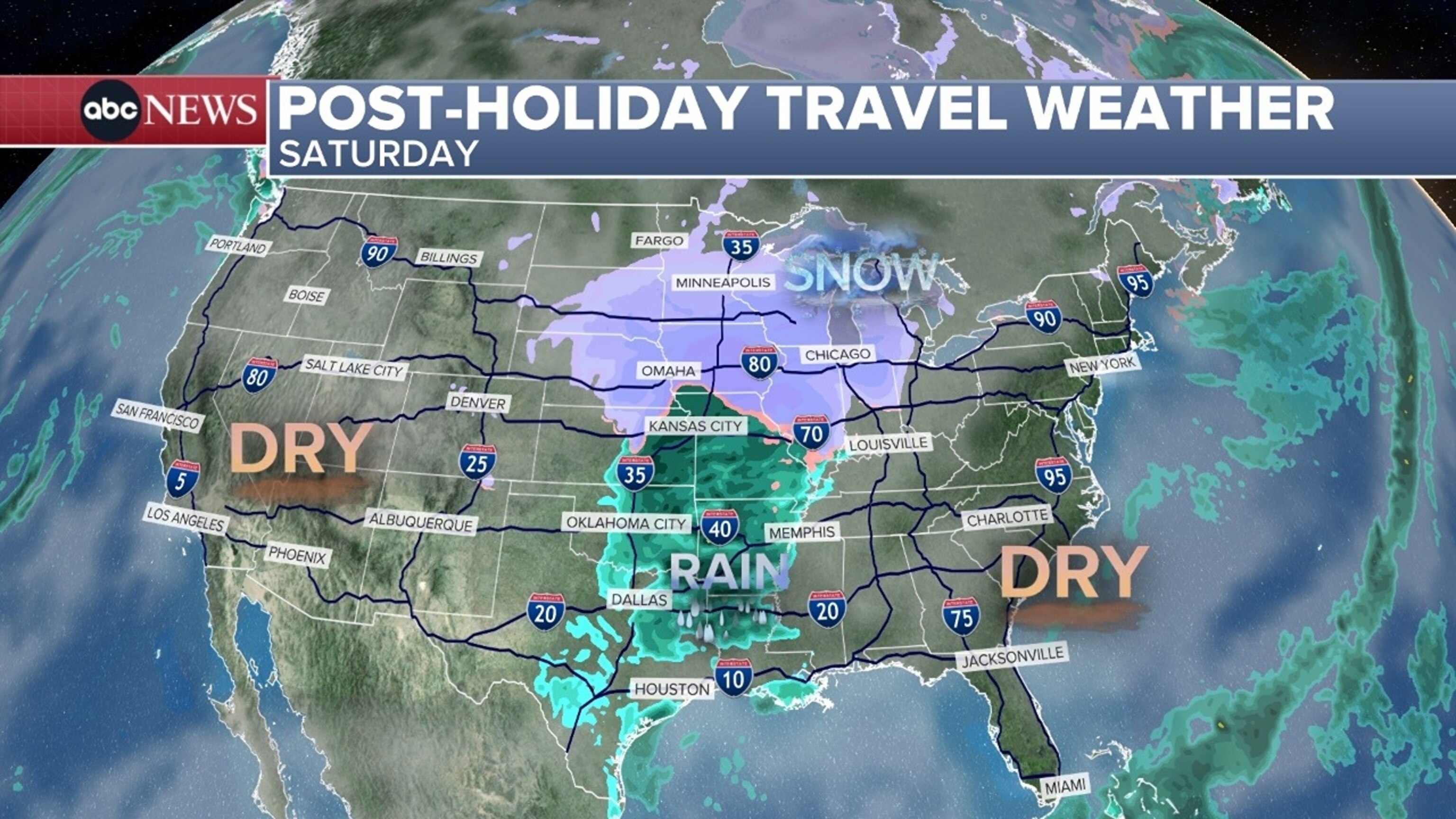 Es posible que llueva desde Missouri hasta Luisiana el sábado, mientras que es posible que nieve desde Nebraska hasta Michigan, incluidos Minneapolis, Chicago y Detroit.