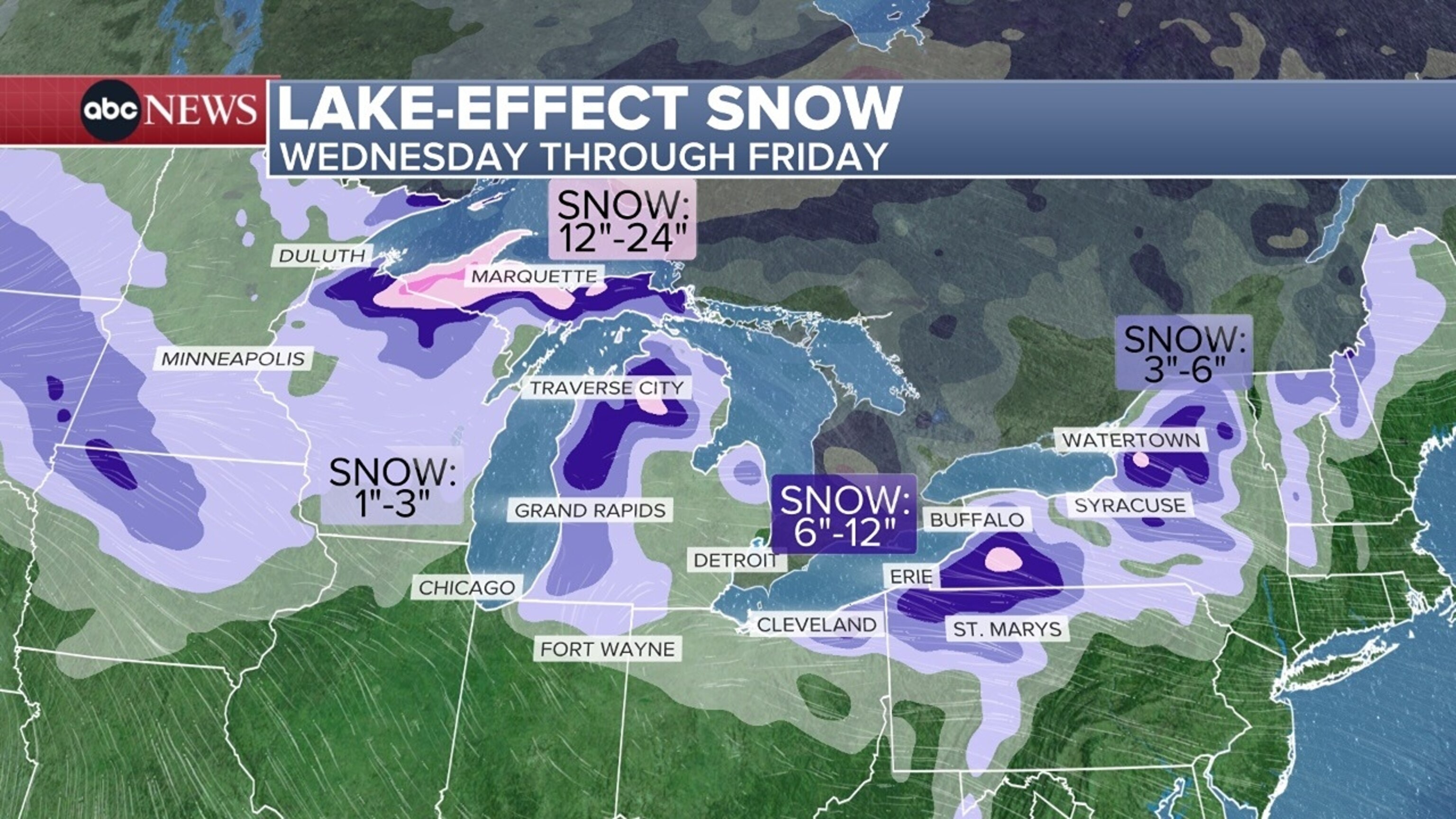 Un aviso de nieve por efecto lago está vigente para lugares como Orchard Park, Nueva York y Watertown, Nueva York desde la 1 a.m. del jueves hasta la 1 a.m. del sábado, con posibles de 10 a 20 pulgadas de nieve en esas áreas.