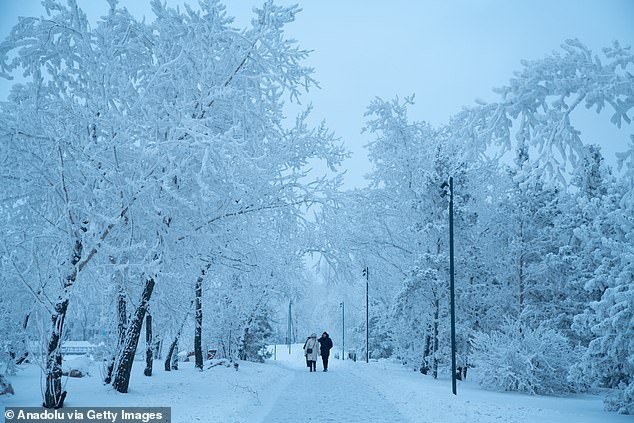 Una vista de los árboles y la infraestructura cubiertos de hielo después de un período prolongado de temperaturas bajo cero de -40 grados Celsius en la ciudad siberiana de Krasnoyarsk, Rusia.