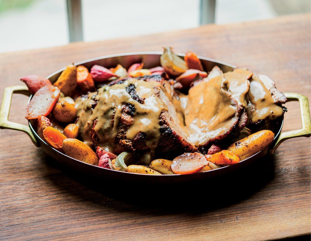 “Elija una paleta de cerdo (a veces llamada ‘colilla’, pero no porque describa el origen de la carne; lleva el nombre de los barriles o ‘colillas’ que los carniceros usaban para transportar cortes de carne económicos en la Nueva Inglaterra colonial) con una capa uniforme de grasa que aporta mucho sabor y, si no es demasiado espesa, llegará crujiente a la fiesta”, escribe. “Coloca la carne de cerdo con una capa de tubérculos hacia el final de la cocción y envuélvela, obtienes un plato lleno de sabor”.