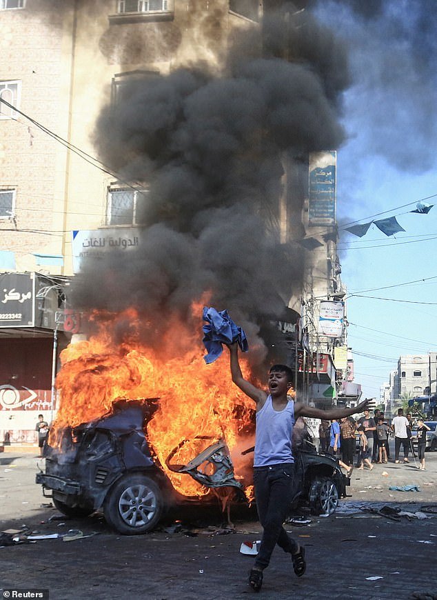 El mes pasado, un oficial de alto rango de Hamas describió la decisión del Reino Unido y otras naciones occidentales crédulos de reconocer a un estado palestino como “uno de los frutos del 7 de octubre”. Imagen: Un niño palestino además de un vehículo israelí ardiente, hombres armados palestinos que fueron traídos a Gaza el 7 de octubre de 2023 después de la infiltración de Israel