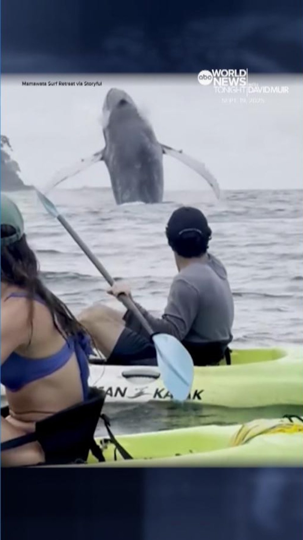 Los kayakistas en Costa Rica tenían la mejor vista de un espectáculo inesperado en medio del mar cuando una ballena jorobada y su altura de la pantorrilla estaban lejos de ellos.