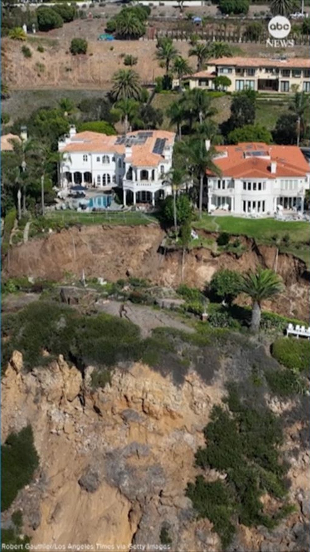 Parte de un acantilado costero rompió que varios patios traseros frenaron y amenazaron casas en Rancho Palos Verdes, California.
