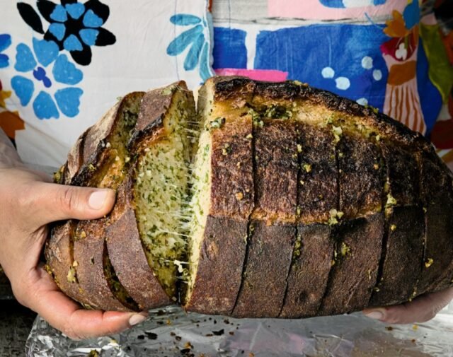 Esta receta del nuevo libro de cocina del chef Samin Nosrat “Good Things” proviene de su cena mensual en la panadería Tartine, donde trató de usar su pan en cada menú. Allí comenzó verticalmente pan para permitir una relación máxima de mantequilla de ajo al pan.