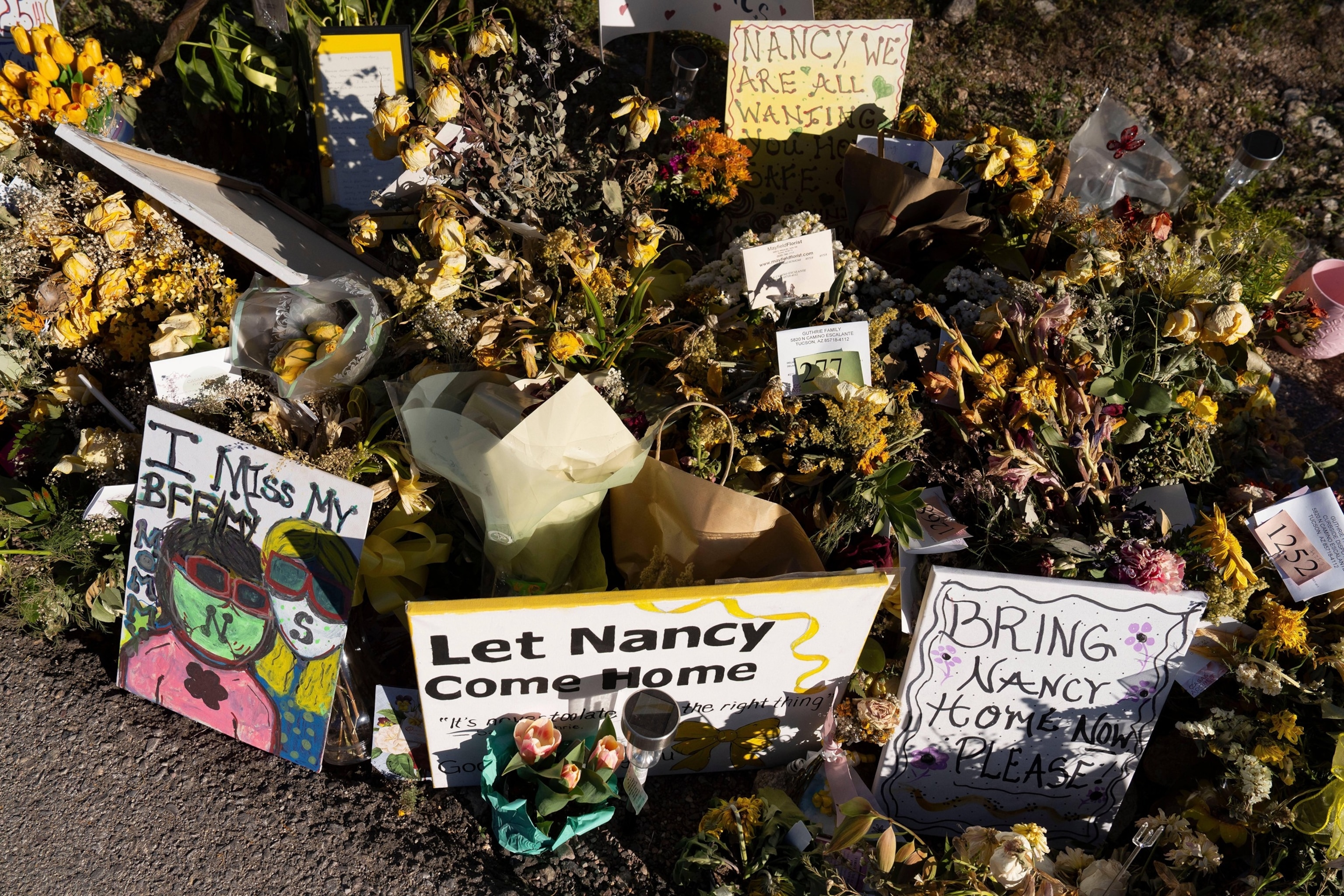 Una colección cada vez mayor de flores y notas amarillas se encuentra en la casa de Nancy Guthrie, la madre desaparecida de la presentadora de “Today” Savannah Guthrie, el 6 de marzo de 2026, en Tucson, Arizona.