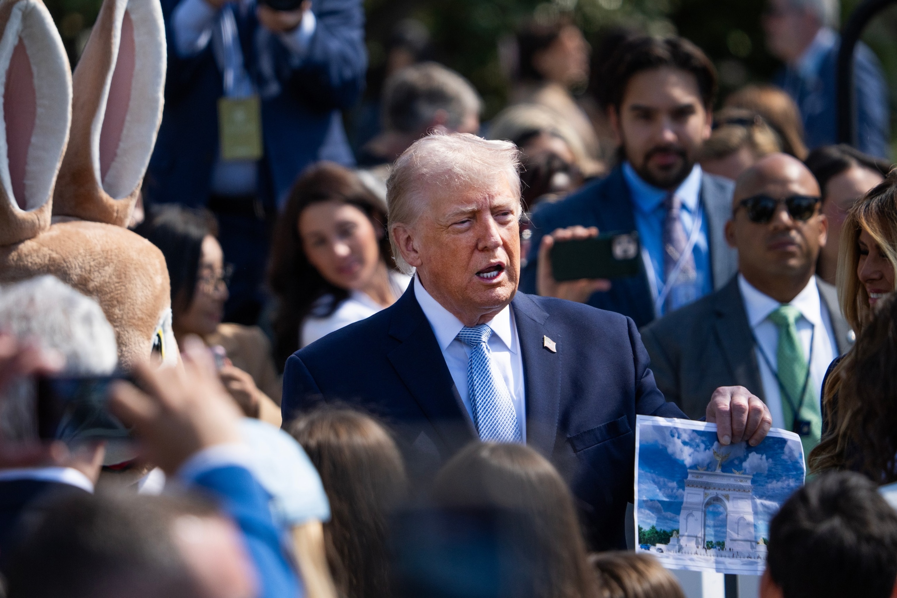 El presidente Donald Trump sostiene una fotografía del arco de triunfo propuesto en el jardín sur durante la ronda de huevos de Pascua de la Casa Blanca el 6 de abril de 2026.