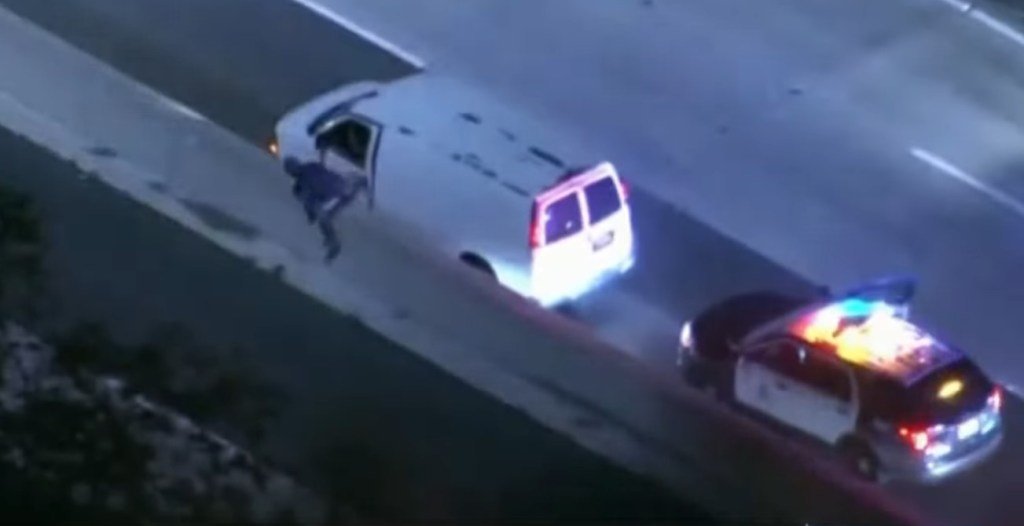 El conductor de la furgoneta salió arrastrándose por la ventanilla de su vehículo, cruzó una mediana e inmediatamente fue atropellado por un coche que circulaba a gran velocidad en sentido contrario, como fue el caso. Transmitido por helicóptero de noticias sigue la persecución.