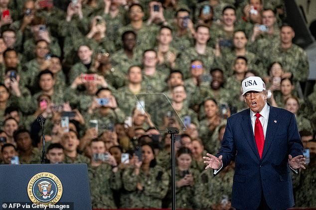 Se ve al presidente Donald Trump apareciendo entre aviones de combate mientras hacía una aparición dramática para dirigirse a los marineros del USS George Washington con base en el extranjero en Yokosuka, Japón.