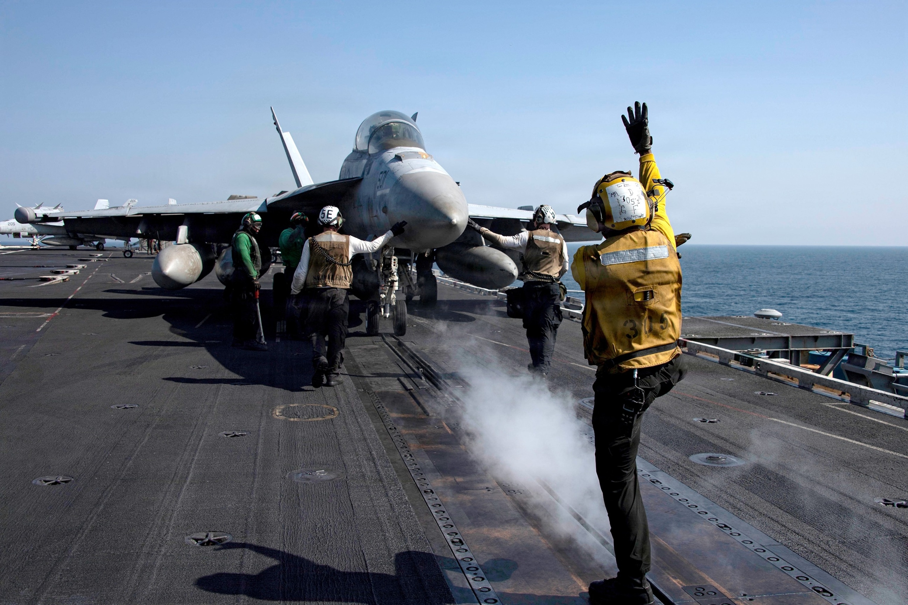 Un EA-18G Growler, adscrito al Escuadrón de Ataque Electrónico 133, se prepara para despegar desde la cubierta de vuelo del portaaviones clase Nimitz USS Abraham Lincoln en apoyo de la Operación Epic Fury, el 7 de marzo de 2026.