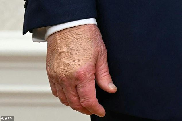 Durante su segundo mandato, Trump aparecía regularmente con moretones en la mano derecha, a veces cubiertos con mucho maquillaje. La Casa Blanca dijo que estaba relacionado con la aspirina que estaba tomando como parte de un programa de salud cardiovascular “estándar”.