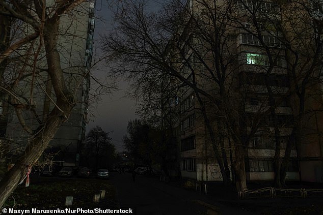Se ven calles oscuras y edificios residenciales durante un importante corte de energía en Kiev, Ucrania, el 8 de noviembre de 2025.