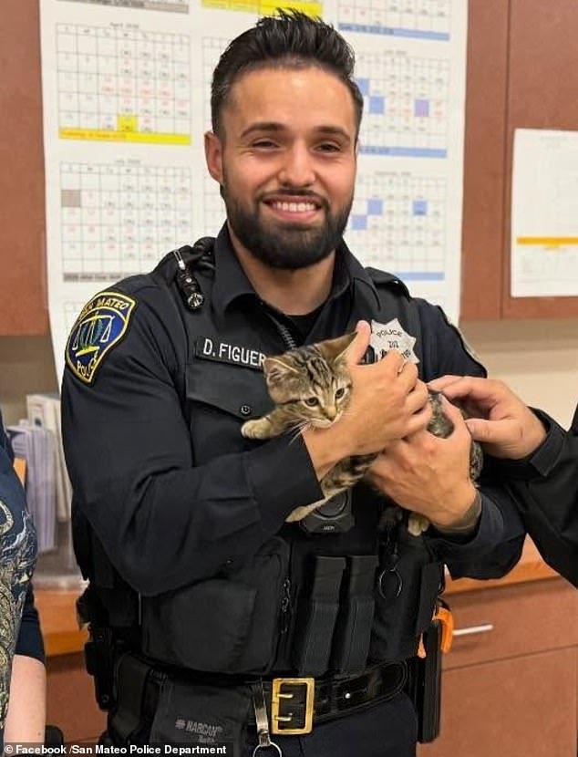 El oficial Figueroa rescató a un pequeño gatito que ronroneaba después de quedar atrapado en un Tesla