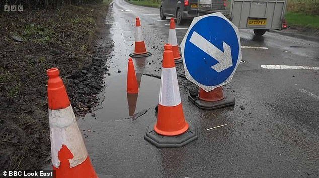 La parte superior de un cono de tráfico sobresale del bache “gigante” que reventó los neumáticos de una treintena de vehículos en la B1062 entre Beccles y Bungay, en Suffolk.