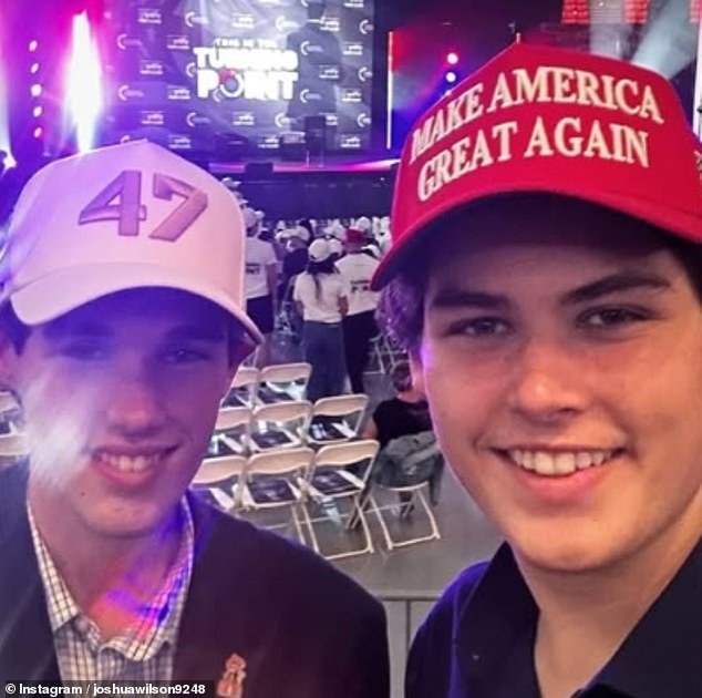 Joshua Wilson, estudiante de tercer año (en la foto de la izquierda), pronunció un discurso en honor a la vida de Kirk el 10 de septiembre mientras llevaba una gorra del 47.
