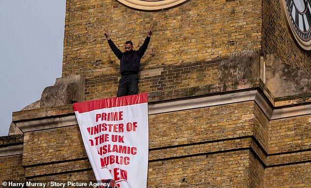 El manifestante había subido al edificio principal debajo de la torre del reloj y desplegaba una pancarta que decía: “Primer Ministro del Reino Unido, la República Islámica ha matado a más de 440.000 personas en sólo dos días”.